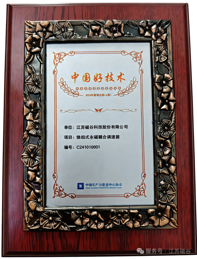 在科技創(chuàng)新的浪潮中,江蘇磁谷再次以硬核實力閃耀行業(yè)! 近日,公司自主研發(fā)的“繞組式永磁耦合調(diào)速器”技術(shù),經(jīng)過中國好技術(shù)評審委員會嚴(yán)格評審,被正式授予2024年度“中國好技術(shù)”稱號。這一榮譽不僅是對技術(shù)先進(jìn)性的權(quán)威認(rèn)可,更是對江蘇磁谷在永磁傳動領(lǐng)域持續(xù)突破的肯定。